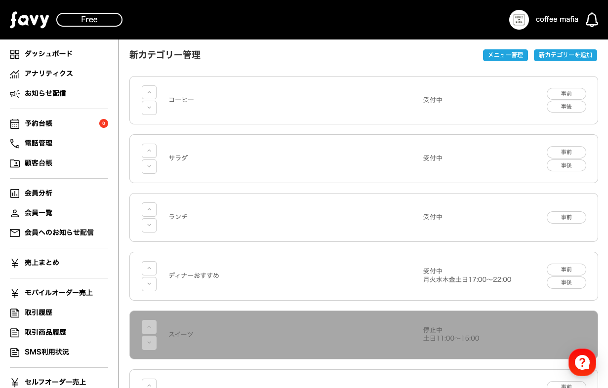新カテゴリーを設定中の店舗では、カテゴリーごとに反映させるサービス(事前決済・事後決済)や表示する曜日時間を設定することが可能です。