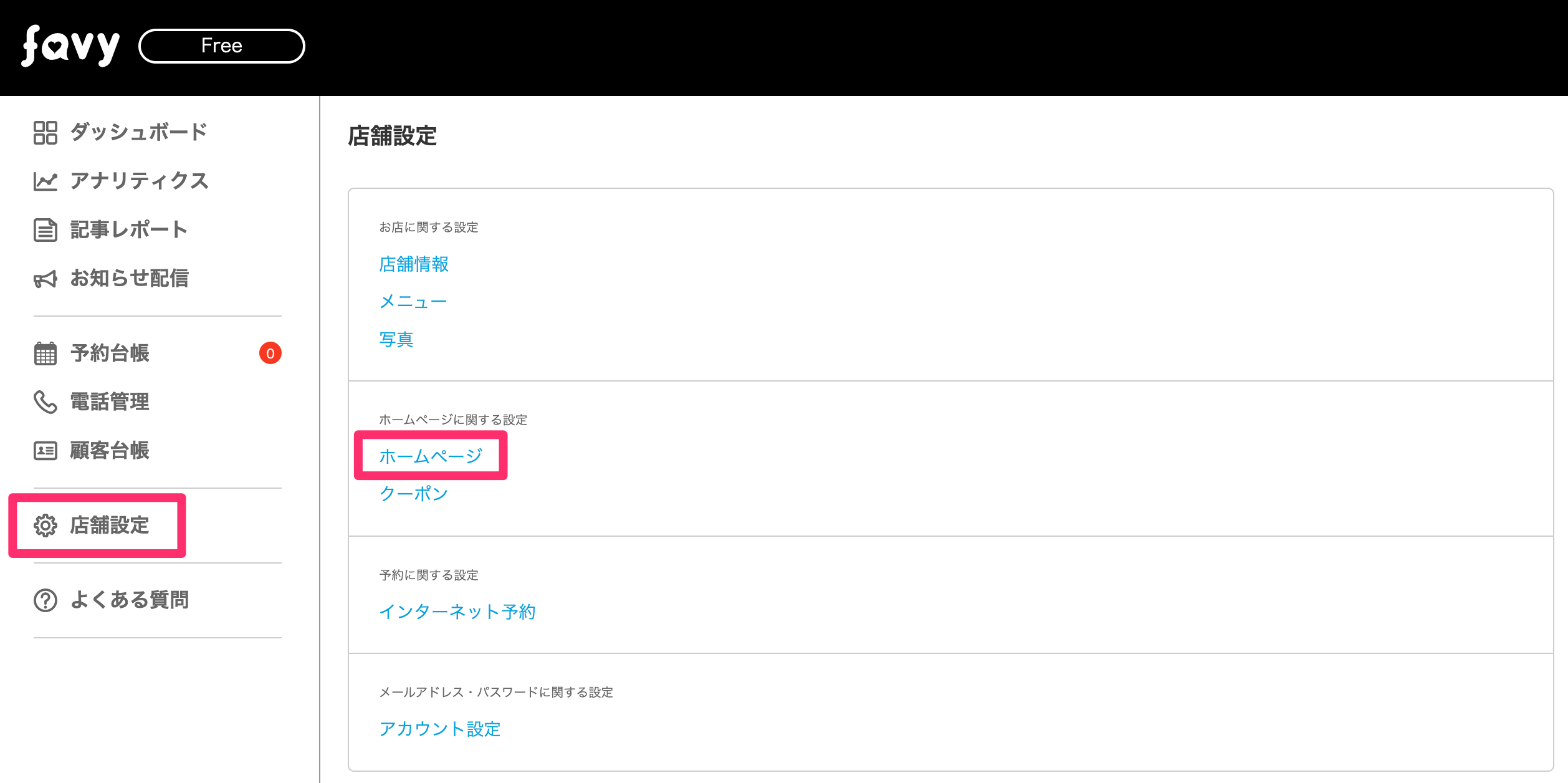 「店舗設定」内の「ホームページ」をクリックする。